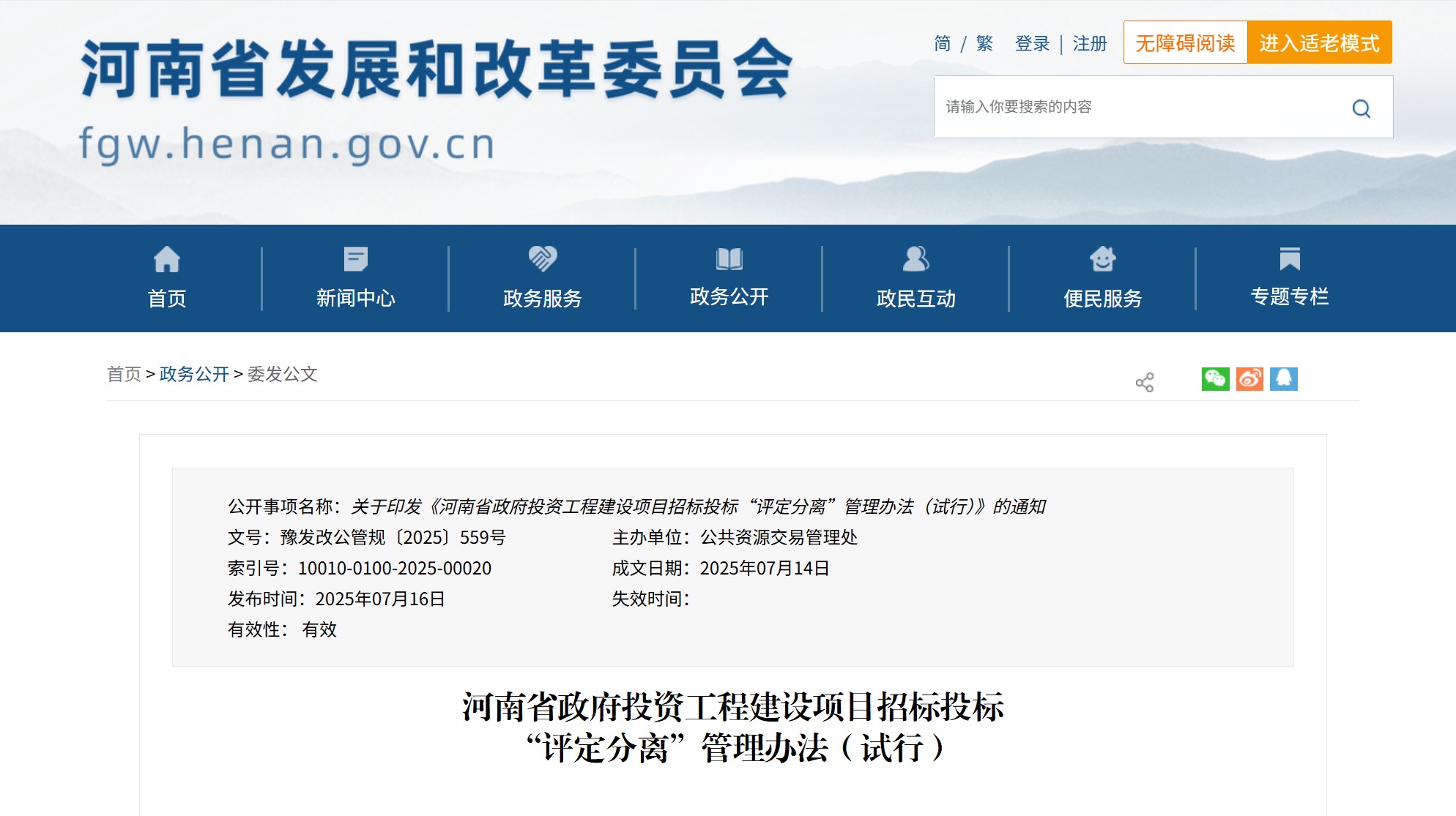 河南省發(fā)布《河南省政府投資工程建設項目招標投標“評定分離”管理辦法(試行)》